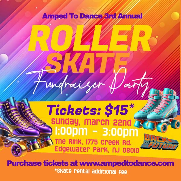 Roll into the future and celebrate Mrs. Dana's birthday for a great cause! 🚀✨Join us for the Amped To Dance 3rd Annual Roller Skate Fundraiser Party! We’re stepping out in our best futuristic swag—think metallics, neons, and holographics. 💿🌈 Every ticket helps us fund new emergency exit stairs for our studio. Your support ensures our dancers stay safe, because safety is our #1 priority!